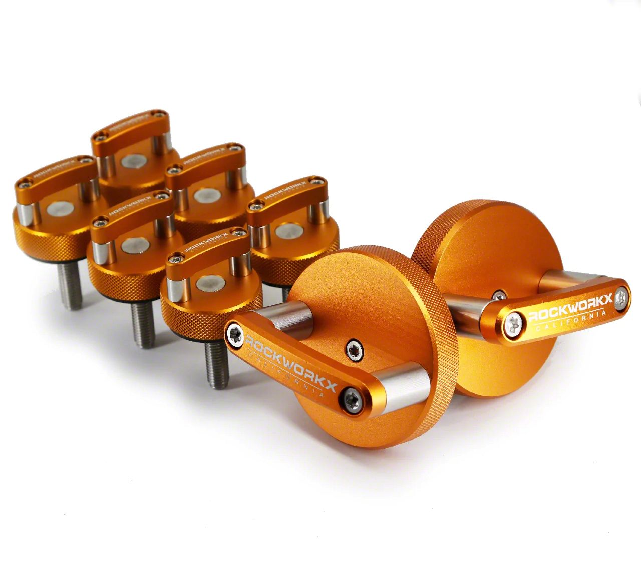 Durable Structure. The ROCKWORKX Freedom Hard Top Quick Release D-Ring Mounting Knobs and D-Ring Thumb Screws are an essential upgrade for any Jeep owner who demands the best in performance and style. These knobs and screws are constructed from high-grade aluminum, providing exceptional strength and durability while keeping the weight down. The orange finish adds a pop of color to your Jeep's hard top, giving it a unique and personalized look. The CNC-machined design ensures a perfect fit and finish, while the resistance to rust and corrosion ensures that these knobs and screws will last for many years of use.