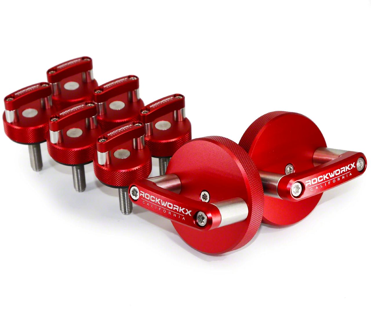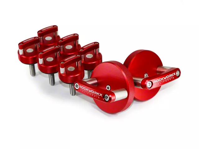 Bright Modern Look. Upgrade your Jeep Wrangler with the ROCKWORKX Freedom Hard Top Quick Release D-Ring Mounting Knobs and D-Ring Thumb Screws. These high-quality mounting knobs and thumb screws are specifically designed to make removing your Jeep's hard top a breeze. The knobs and screws are made from durable materials and feature a red finish, adding a stylish touch to your vehicle. The quick-release design allows for easy and tool-free installation and removal of your hard top, saving you time and hassle.