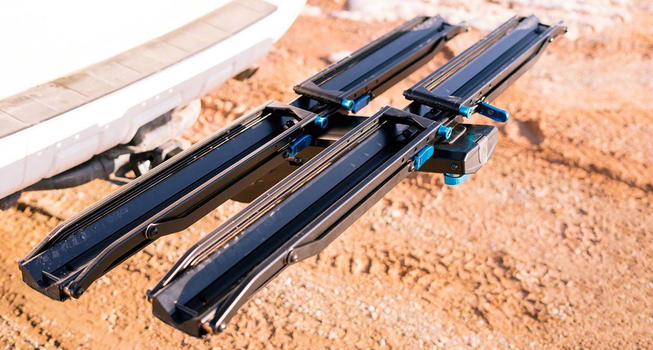 The GuideRail steps away from the traditional carrying style of platform hitch racks; By utilizing dual load arms, the rack completely eliminates frame or fork contact, it allows for asymmetric bike loading to avoid handlebar interference, and it creates a simple aesthetic that virtually blends in with most vehicles. The GuideRail reduces plastic parts to a minimum and maintains the same capacity and reliability of the MonoRail Family. Carrying bikes up to 60lbs per tray, tires up to 3” wide, and wheelbases up to 55” the GuideRail can handle just about anything including most E-bikes. Included is a 10mm square link chain to secure your bikes without stress.