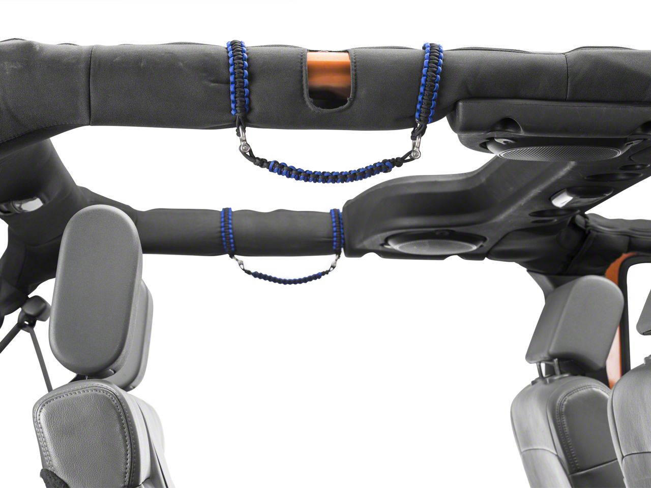 Military Styling and Strength. These Black and Blue Paracord Grab Handles a simple but important upgrade for your passengers and for off-roading security. Constructed from military-grade Paracord, these Rear Grab Handles feature the same strength and utility the US Armed Forces rely on for their paratroopers' chutes, and for securing and tying down equipment and tents in severe conditions.
