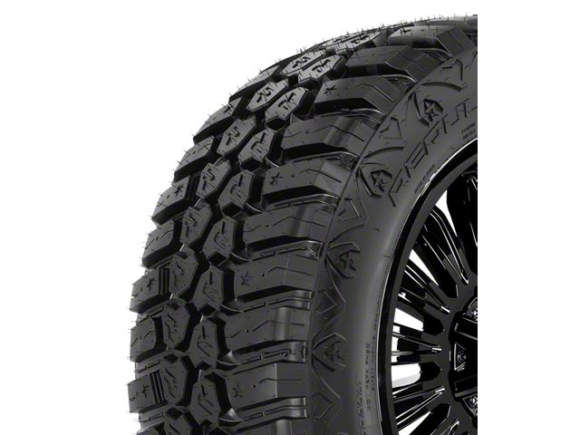 Construction and Appearance. This tire features a specially designed tread pattern with large, staggered elements and wide grooves, complemented by an open shoulder design. Its rugged construction and premium materials provide durability and excellent grip, while the aggressive styling enhances the appearance of your vehicle.