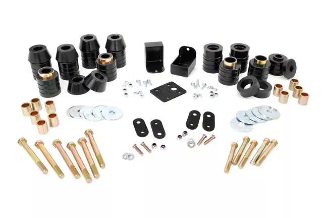 Rough Country's innovative new 1" Polyurethane Body Lift reduces chassis noise and vibration, featuring specially blended Polyurethane bushings that are resistant to fluids and road grime. Kit includes grille Support Brackets, Radiator Shroud Relocation Brackets, Shift Relocation Brackets for automatic transmissions and durable Grade 8 Hardware