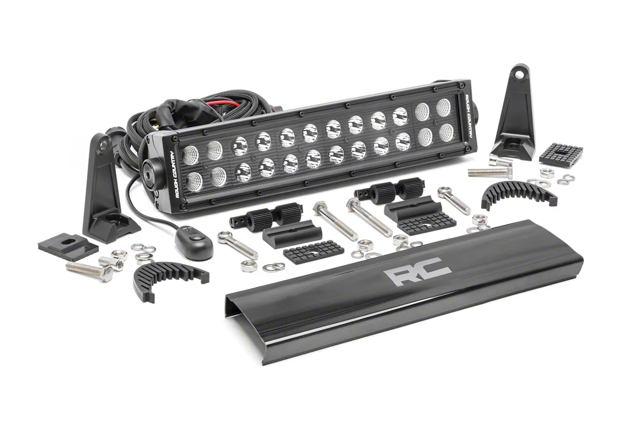 Off-Road Lighting. In order to ensure you get the off-road illumination you require, install Rough Country's 12 inch Black Series Dual Row LED Light Bar Flood/Spot Combo. With multiple mounting options for a lighting solution that is tailored to your application, this light bar pierces through the snow, fog, rain, and darkness to improve your visibility. It also comes with a black panel design for added style and noise silencers that snap over the cooling fins to reduce hums, whistles, and other wind noises for a silent beam.