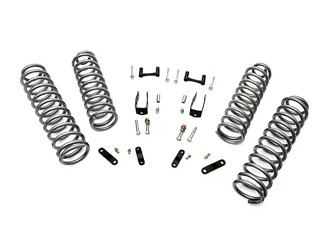 Functionality. The front and rear lifted coil springs of this Jeep Wrangler JK lift kit raise the height of your vehicle for increased ground clearance. This kit also lets you install up to 35-inch tires to give your vehicle a muscular, off-road look. Shock relocation brackets included in this jeep suspension lift kit let you use your vehicle's factory shocks.