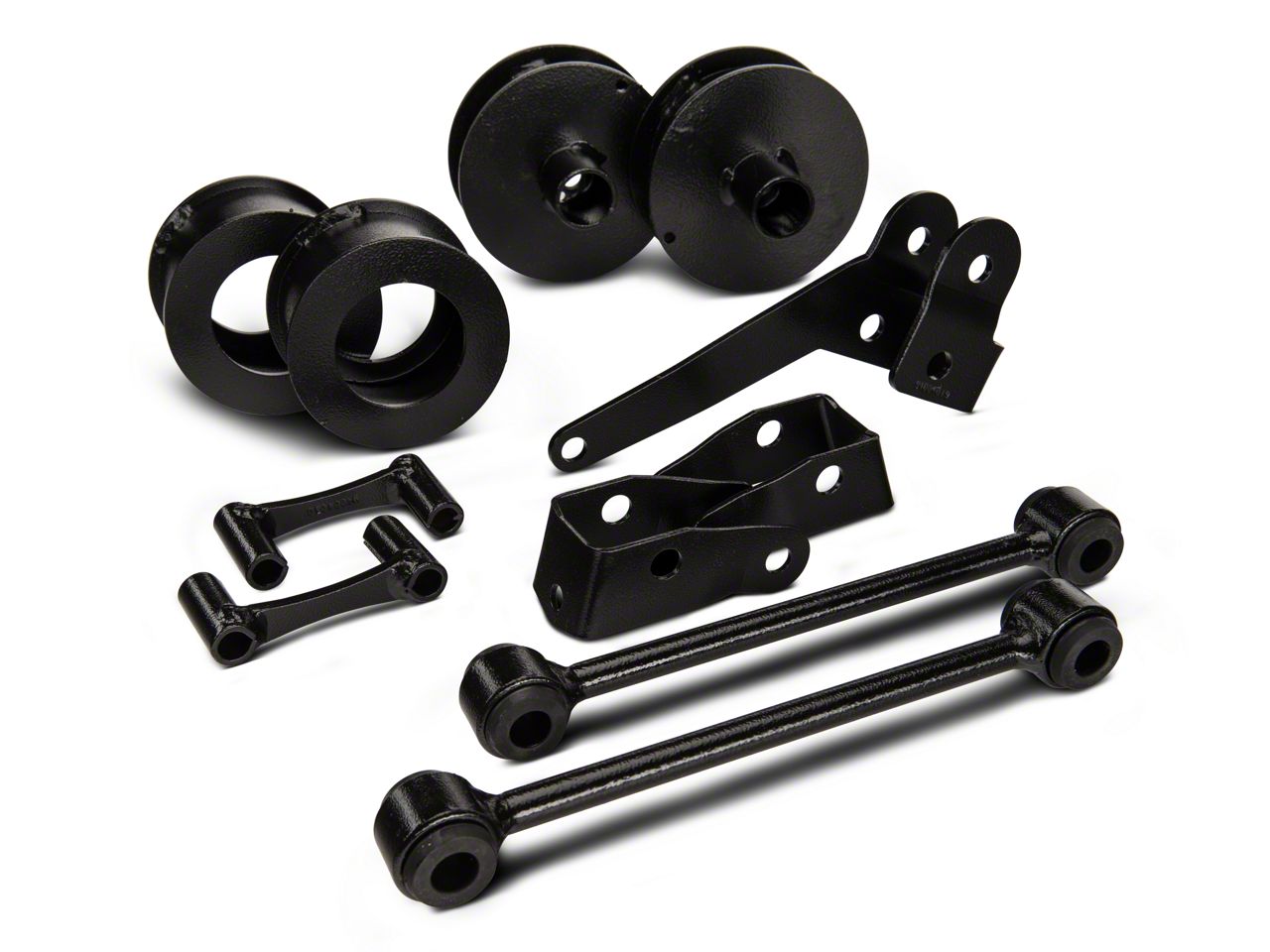 Kit Includes. The Rough Country 2.5-inch Series II Suspension Lift Kit comprises front and rear coil spring spacers, brake line brackets and shock relocation brackets. It also includes track bar bracket and sway bar links.