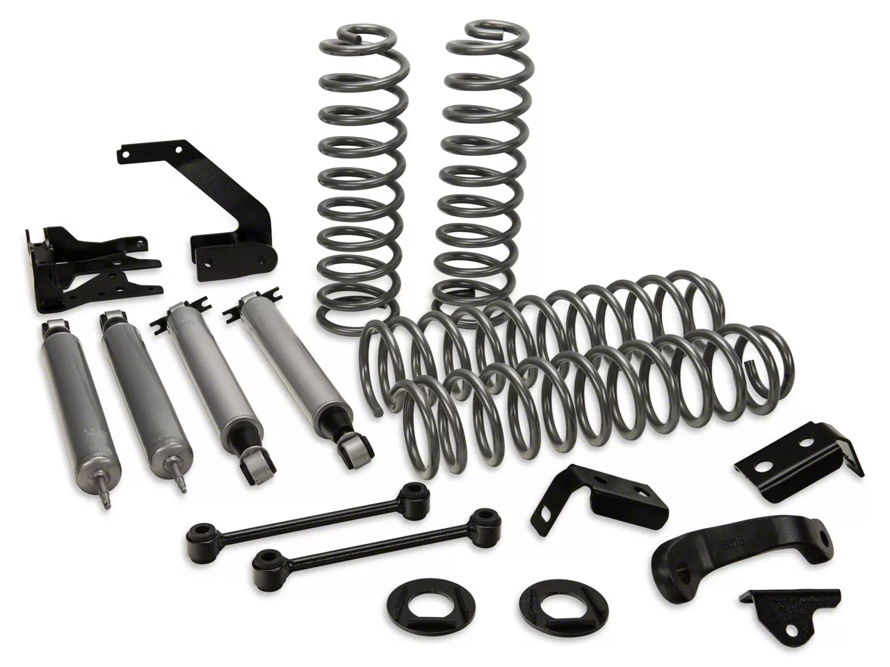 Lift Construction. Made specifically for the Unlimited, this kit is tailored to 4 door model's weight and size. The kit uses coil springs and 2.2 series shocks to add lift. This package is also made for use with the OEM control arms however aftermarket arms may be used. Parts included are brake line brackets and relocation, cam bolts, rear sway bar links, and a pitman arm. The product also includes a rear coil correction plate which adjusts the rear coil angle by 10 degrees, amplifying the performance.