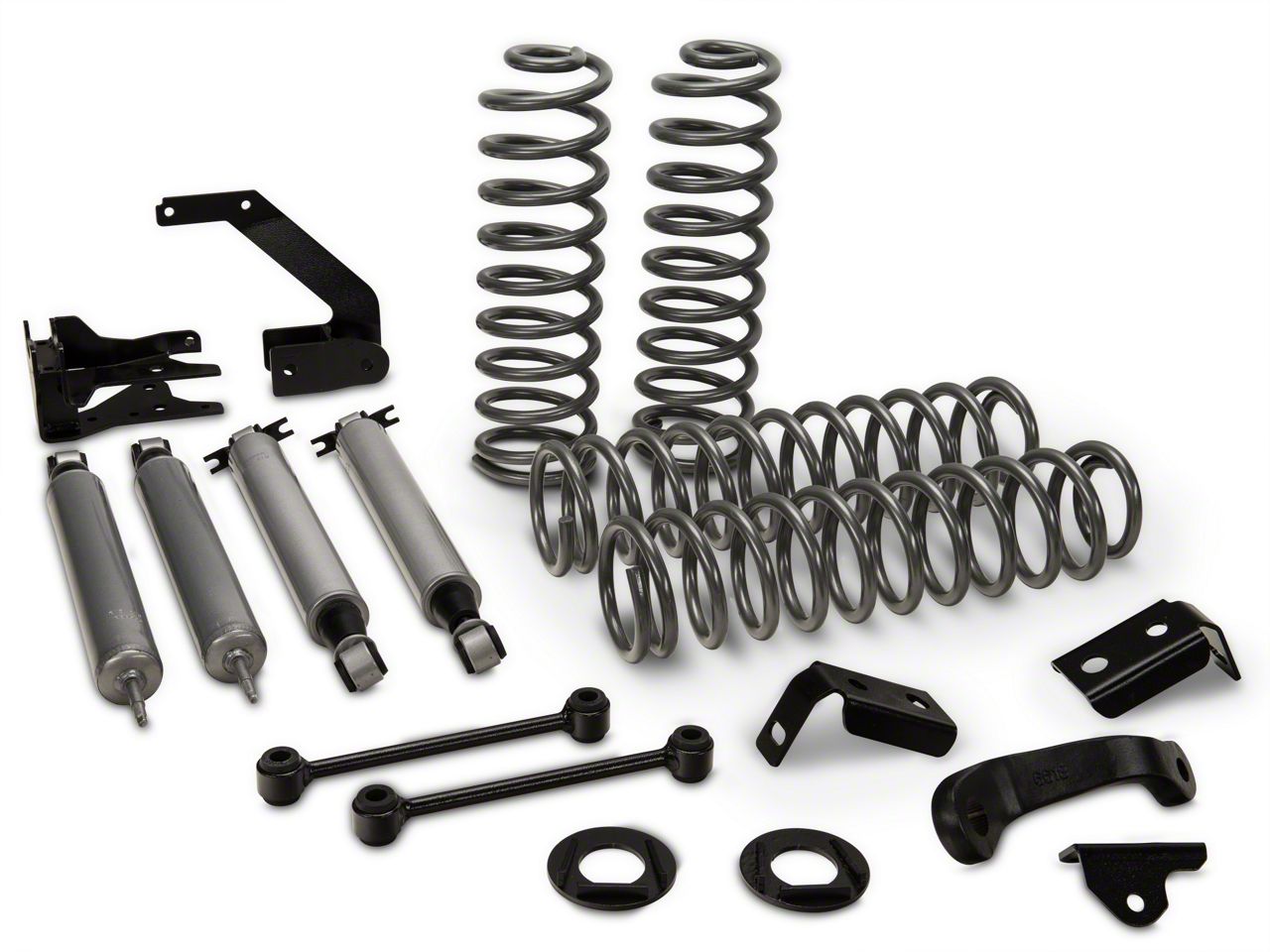 What's in the Kit. The Rough Country 4-inch Suspension Kit includes bar brackets, front sway bar links, front and rear coil springs, brake line brackets, cam bolts, Premium N3 Series shock absorbers and a pitman arm.