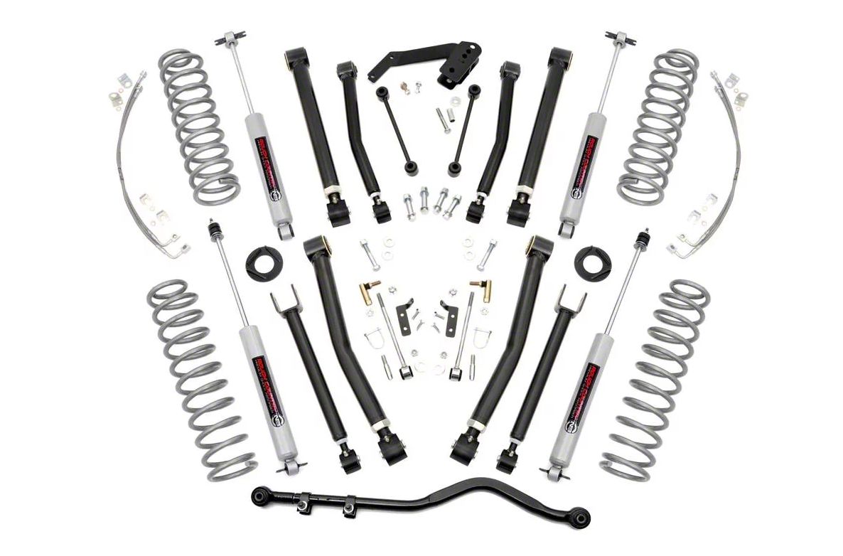 What's in the Kit. The kit includes front and rear lifted coil springs, adjustable control arms and stainless steel brake lines, coil correction plates, sway bar links, quick disconnects and an adjustable track bar. Made of heavy-duty materials, each component in the kit can withstand the impacts of rough, off-road use.