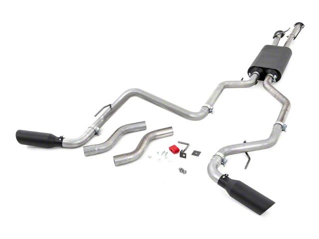 Intimidating Sound. Your Toyota Tundra becomes an even more formidable off-road driving machine than before with this Side/Rear Exit Rough Country Dual Exhaust System with Black Tips. Its high-flow muffler and mandrel-bent pipes have been specially designed to promote smoother exhaust exit. This gives your vehicle an intimidating, guttural sound that is hard to resist each time you step on the gas.
