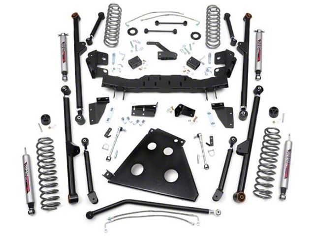 Front: Lifted coil springs, adjustable track bar, sway-bar disconnects, stainless steel brake lines, HD lower skid plate, X-Flex lower control arms and upper radius arms, crossmember w/frame strengthening brackets, shock relocation brackets & hardware.