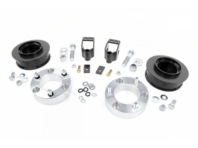 Installation. The installation of Rough Country 3-Inch Spacer Suspension Lift Kit; Aluminum bolts to the top of the existing strut assemblies, with no drilling required.