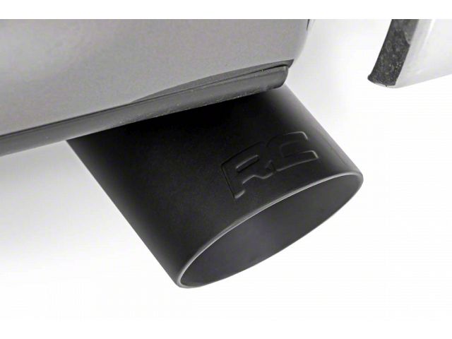 Bold and Aggressive Style. Enhance the look and sound of your vehicle's exhaust system with the Rough Country Angled Cut Dual Wall Round Exhaust Tip with RC Logo. With a 4.25-inch outlet diameter, it offers a bold and aggressive appearance, adding a touch of style to your vehicle's rear end. The exhaust tip is covered in flat black paint, providing a sleek and stealthy look that complements any vehicle.