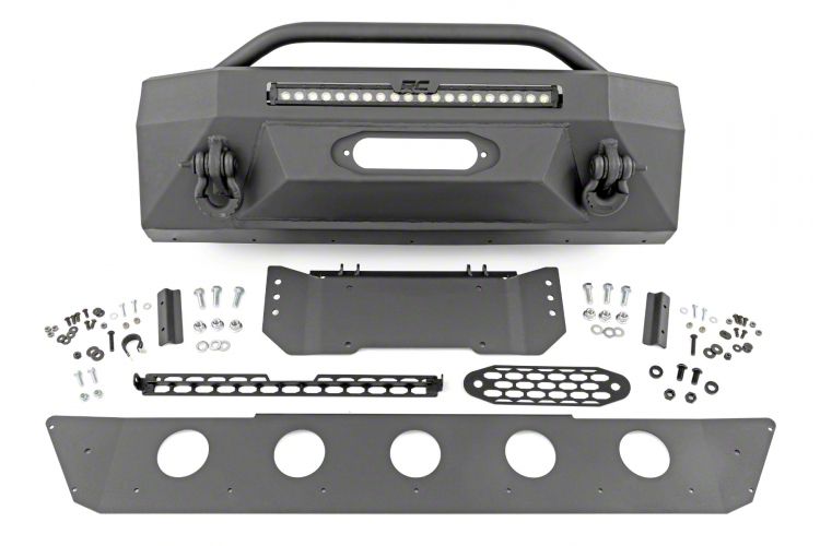 Robust Construction and Reliability. Constructed with resilience in mind, Rough Country's bumper stands up to the toughest conditions. It features a modular design that allows for customizable LED light configurations. The powder-coated flat black finish ensures durability, resisting the elements and corrosion.