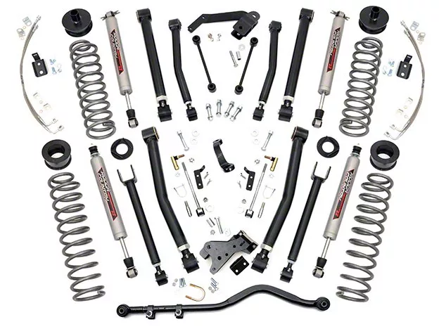 Reliable Components. The high-performance 2.2 shocks in this Jeep Wrangler JK lift kit minimizes bumps even when you're driving through rough terrains. The included coil correction plates correct the rear coil angle by 10 degrees to enhance the performance of the rear coil springs. The fully re-buildable X-flex control arms in this jeep suspension lift kit let you adjust the pinion angle of the axles to offer perfect articulation that ensures smooth off-road ride.