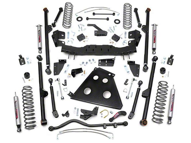 Lift Construction. It doesn't get much more complete than this kit. The only thing you would need is a replacement rear driveshaft to maintain the correct pinion angle. You wouldn't want that to slip out on the trail! The adjustable control arms are 2 inches in diameter with flex joints for excellent articulation. The dual Y-link setup gives your axles the room the move so you can navigate the trails with confidence. The skid plate is 1/4 inch thick steel to keep your rig's underside protected. Rough Country's 2.2 series performance shocks are designed with Wrangler owners in mind. Rough Country takes into account for drivers utilizing over sized tires and wheels, so they make their shocks that much tougher.