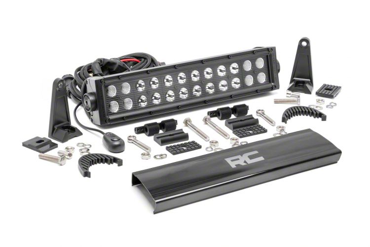Off-Road Lighting. In order to ensure you get the off-road illumination you require, install Rough Country's 12 inch Black Series Dual Row LED Light Bar Flood/Spot Combo. With multiple mounting options for a lighting solution that is tailored to your application, this light bar pierces through the snow, fog, rain, and darkness to improve your visibility. It also comes with a black panel design for added style and noise silencers that snap over the cooling fins to reduce hums, whistles, and other wind noises for a silent beam.