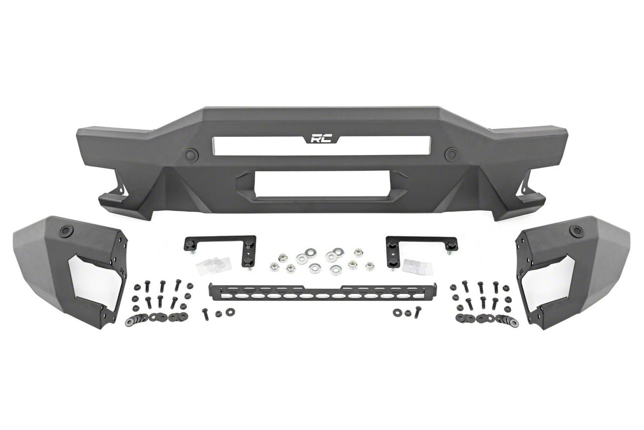 Rugged Front Bumper. The Rough Country Full Width Front Bumper is designed to enhance both the style and protection of your vehicle. It provides robust coverage to safeguard your lights and engine from potential trail hazards while offering a bold and aggressive look for your Bronco. This bumper accommodates the installation of light bars to improve nighttime visibility and compliment your off-road upgrades.