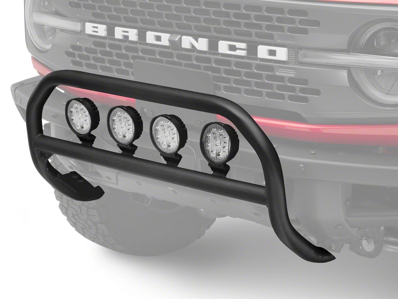 Application. The Rough Country Nudge Bar with 4-Inch Round LED Lights fits 2021-2026 Bronco with Modular Front Bumper.