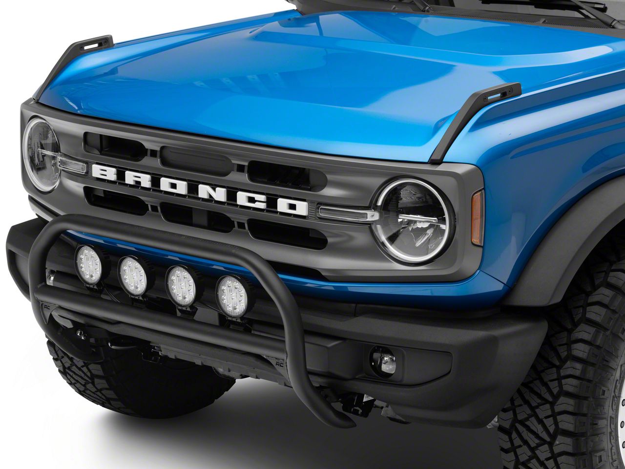 Application. This Rough Country Nudge Bar with 4-Inch Round LED Lights is designed to fit 2021-2026 Ford Bronco models. Does not fit models equipped with a factory tow hooks mounted in the bumper. Only fits models with tow rings mounted under the factory front bumper.