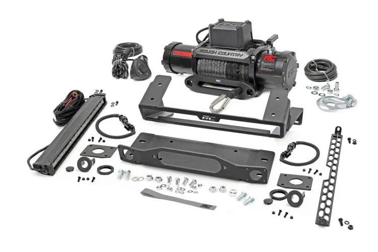 Powerful Off-Road Winch System. Elevate your off-road experience with the Rough Country Winch Mount, 20-Inch Black Series White DRL LED Light Bar, and PRO12000S Winch combination. Whether you're tackling tough trails or need heavy-duty towing, this setup is purpose-built for the job. The winch mount offers a secure foundation for the PRO12000S winch, ensuring you have the power to handle challenging situations. To light up the path ahead, the package includes a 20-inch Black Series White DRL LED Light Bar, enhancing visibility during nighttime adventures or rescue missions.