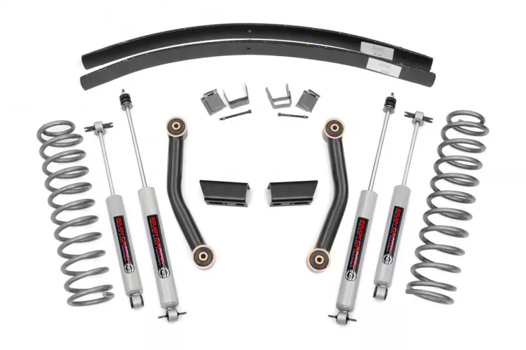 Enhanced off-Road Lift. Take your Jeep Cherokee to new heights with the Rough Country 3-Inch Series II Suspension Lift Kit with Add-A-Leafs and Premium N3 Shocks. The Lift Kit is designed with your convenience in mind. It's relatively easy to install, requiring no strut or coil disassembly. This kit allows for the use of up to 31-inch tires, further enhancing your vehicle's off-road prowess and giving it a more aggressive look.