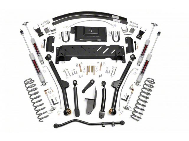 Ample Ground Clearance. Say goodbye to limitations and conquer the toughest terrains with ease. This Rough Country 4.50-Inch Long Arm Suspension Lift Kit with Add-A-Leafs and Premium N3 Shocks provides the extra clearance you need to confidently overcome obstacles. No more worrying about rocks, roots, or uneven terrain. With this kit, you'll effortlessly navigate through any off-road adventure that comes your way.