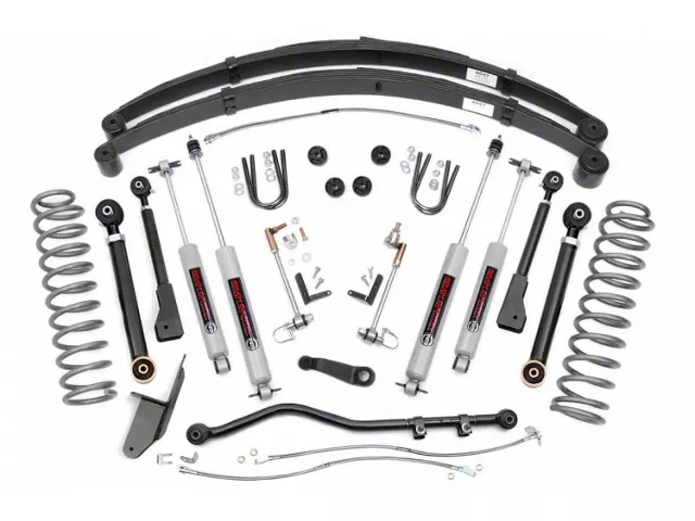 This X-Series kit features Rough Country's X-Flex Control arms in the front upper and lower position. X-Flex Arms are fully adjustable, and feature a ball-in joint, massive 2.5in diameter body, and huge 1.25in threads. X-Flex Control Arm Joints have long offered considerable range, strength, and safety for off-road applications - but it doesn't stop there. Also included is a transfer case drop kit, forged adjustable track bar, stainless steel brake lines, and sway-bar disconnects. A set lifted coil springs and all-new rear lifted leaf springs help your XJ gain a total of 4.5in in lift - plenty of clearance for 32in tires.