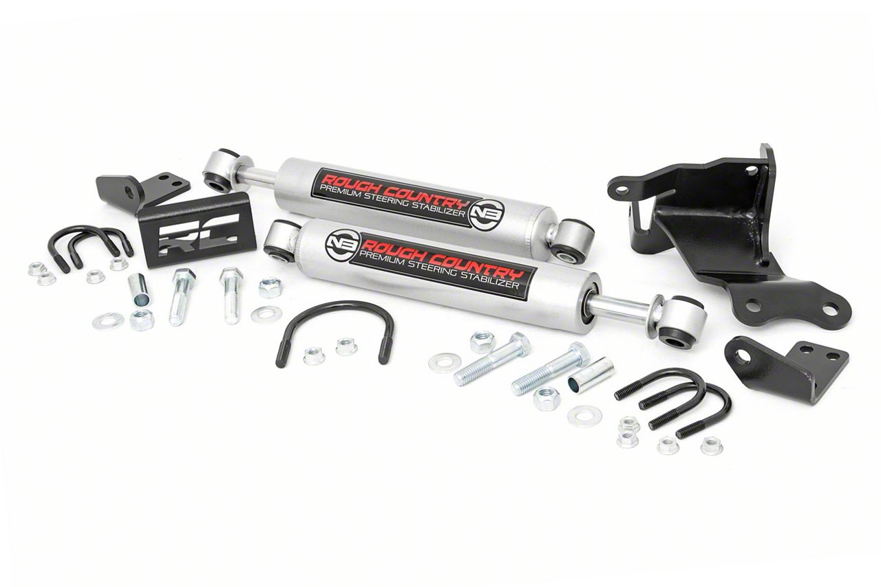 Designed for the Trails. This Rough Country Dual N3 Steering Stabilizer for 2.50+-inch Lift has been specially designed for rugged terrain. It features a chrome hardened, 9/16-inch piston rod and thick steel brackets for secure installation. Indeed, this steering stabilizer is up for the punishing demands of the trail.