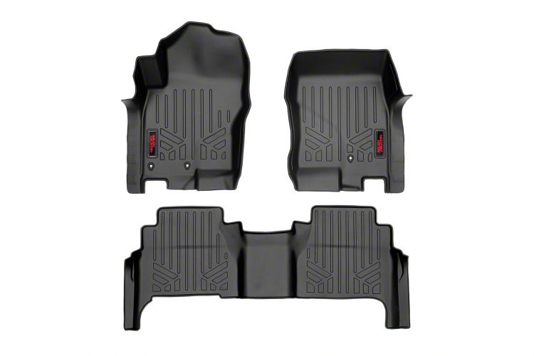 Excellent Functionality. Introducing the Rough Country Heavy Duty Front and Rear Floor Mats, the ultimate solution to keep your vehicle's interior spotless and protected. Engineered to withstand all weather conditions, these durable mats provide exceptional defense against harmful elements, ensuring your vehicle's floor remains free from dirt, mud, snow, and debris. The spill saver lip and textured surface design offer additional protection against liquids, containing any accidental spills or messes, keeping your floor pristine.
