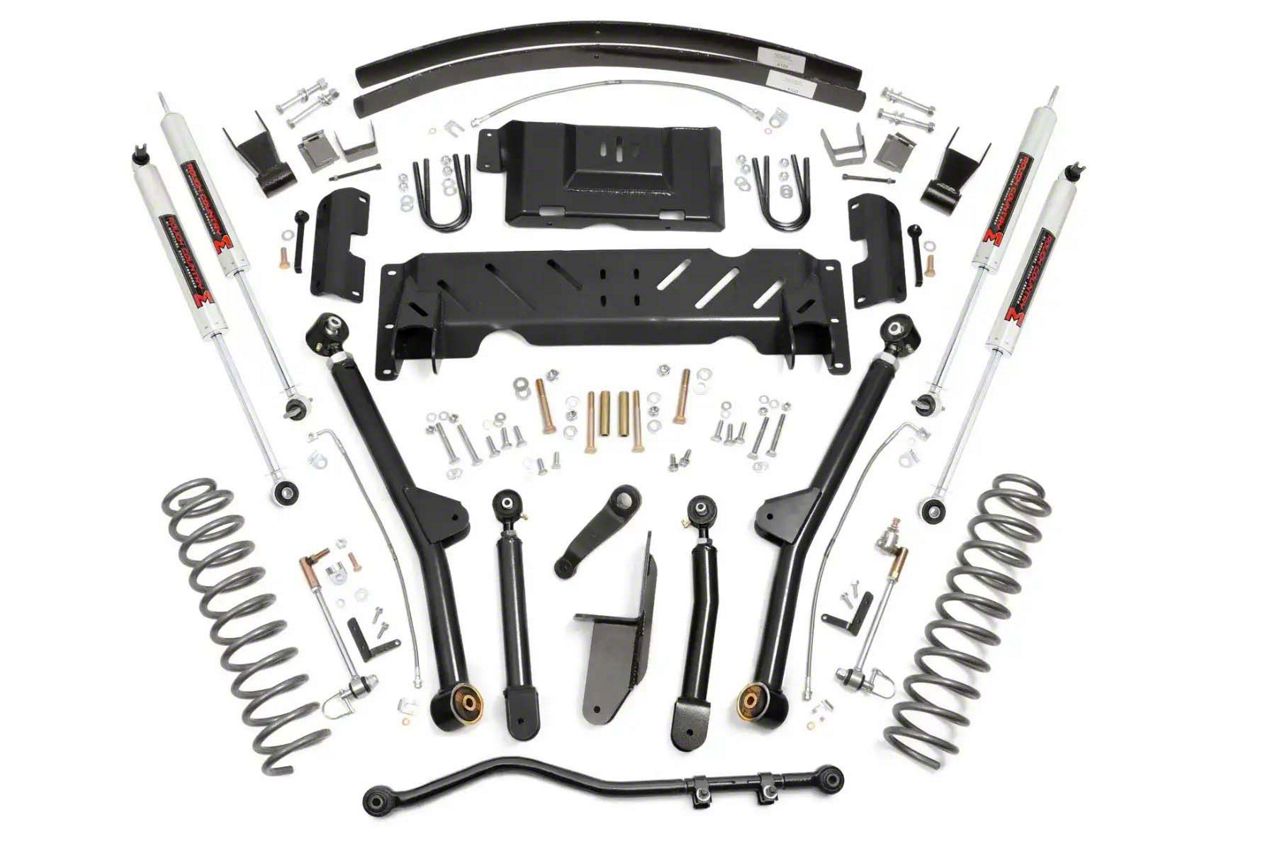 Suspension Lift Solution. The Rough Country Suspension 4.50-Inch Long Arm Suspension Lift Kit with Rear Add-A-Leafs and M1 Monotube Shocks is designed to elevate the off-road performance and ground clearance of your Jeep Cherokee XJ. This kit improves suspension articulation, enhances alignment angles, and delivers a more aggressive stance, making it ideal for challenging trails and rugged terrain.