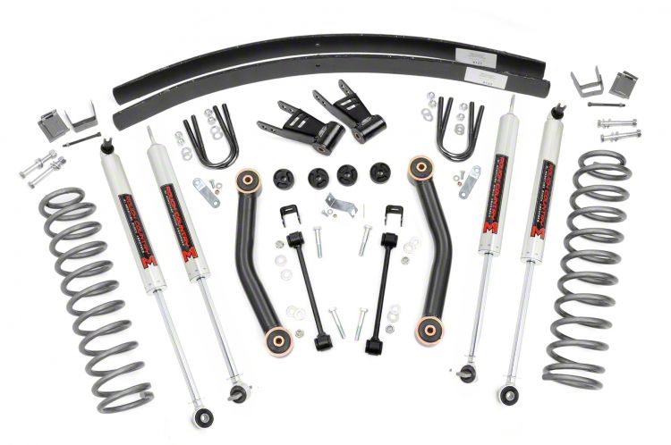 Improved Performance. Made for the Jeep Cherokee XJ models without AX transmission, this Rough Country Suspension Lift Kit comes in a raw metal and matte black finish. Built to increase your ride’s lift to 4.50 inches and maximum tire size to 32 inches, this kit offers improved and balanced on and off road performance. This kit includes custom 10 stage variable tuned M1 monotube shocks and an Add-A-Springs kit.