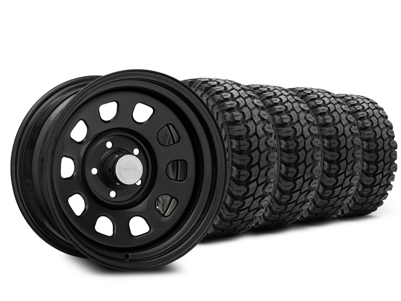 Mounted and Balanced Wheel and Tire Kit. This wheel and tire combo kit features (4) 17x9 Rough Country Steel Gloss Black Wheels and (4) Gladiator Mud-Terrain X-Comp M/T 35" - 35x12.50R17 tires that have been put together into an easy to buy kit that arrives to your door already mounted and balanced ready to be installed on your vehicle.