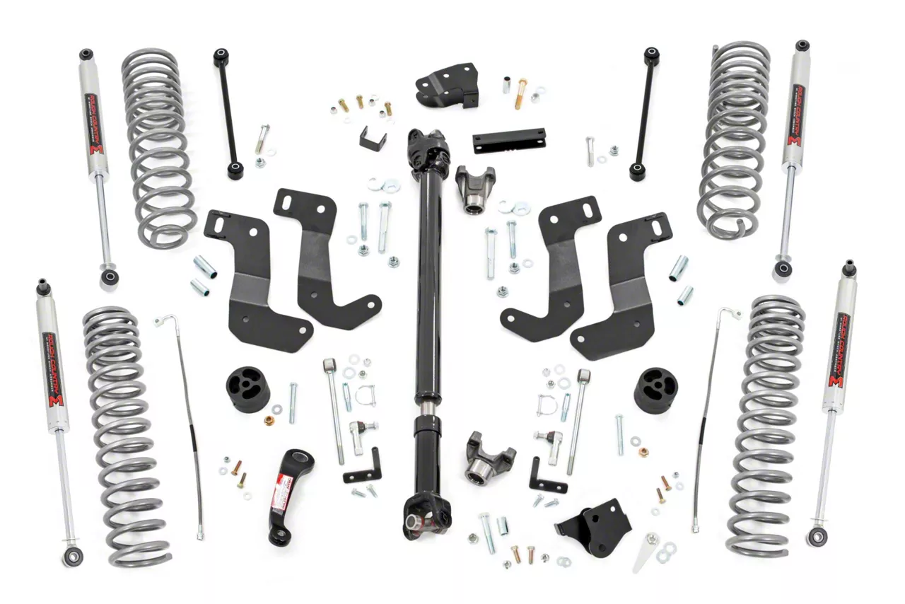 Complete Lift Upgrade. The Rough Country Suspension Lift Kit is designed for drivers who want both aggressive stance and improved off-road capability. Delivering a full 6-inch lift, this all-in-one package transforms your Jeep’s ground clearance and handling dynamics while enhancing ride comfort with included M1 monotube shocks. This Rough Country Suspension Lift Kit fits 2020-2026 3.6L Jeep Gladiator JT models, excluding Mojave models.