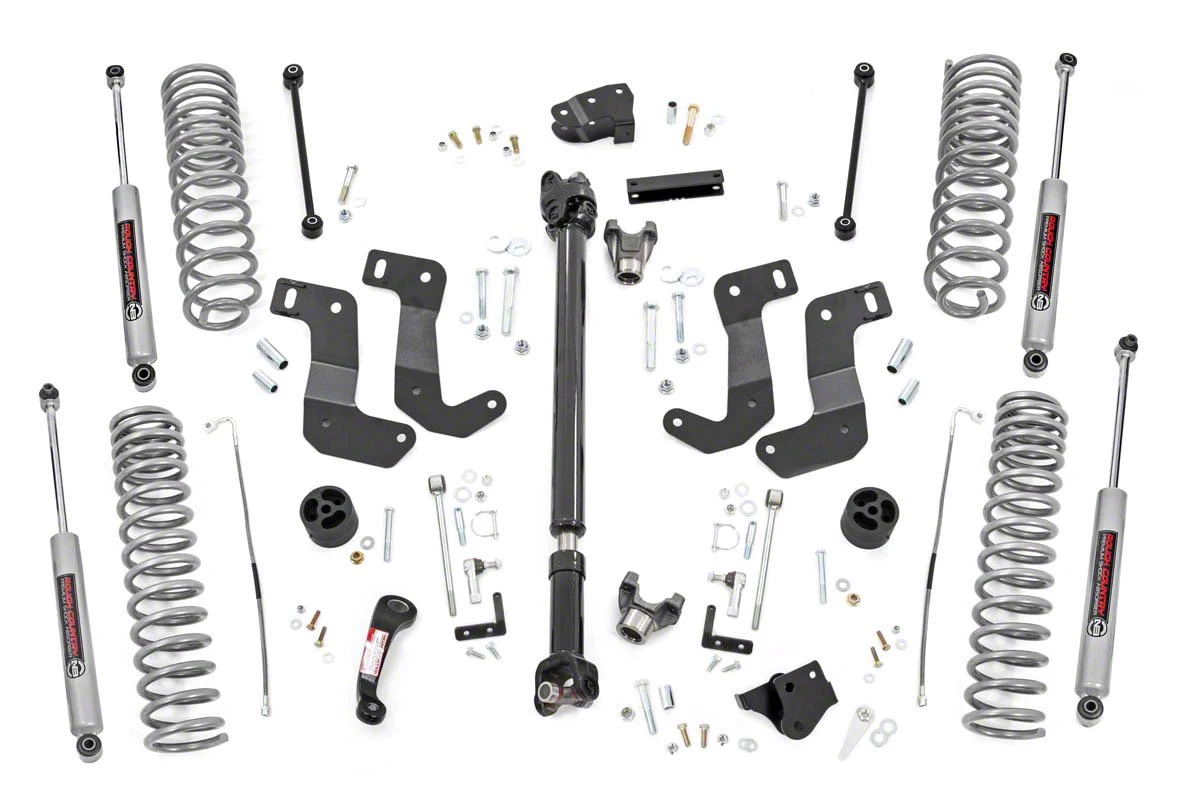 Improved All-Terrain Dynamics. Drive your Jeep Gladiator to the rugged terrains with assurance and confidence that it can crawl with optimum stability. This Rough Country 6-Inch Suspension Lift Kit with Premium N3 Shocks is built for the rough off-roaders looking for optimum trail performance with street stability. It comes with a set of Premium N3 Shocks, progressive rate coil springs, CV driveshaft, pitman arm, and track bar brackets.