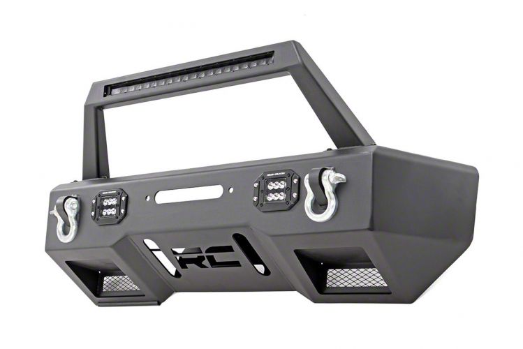 Bold Styling. The Rough Country Black Series LED Stubby Winch Front Bumper is the perfect way to give your Jeep a more aggressive, off-road look. The satin black finish and laser-cut RC logo give it a unique, stylish look that will make your Jeep stand out from the rest.
