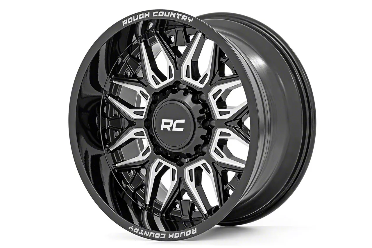 The 20x10 Rough Country One-Piece Series 86 Gloss Black Milled Wheel; 20x10 is given a gloss black finish to keep your wheel looking as sharp as its design. This wheel’s milled steel accents are where it really shines through, and quite literally. It makes the split section of the spokes pop and adds great accents along the faux beadlock.