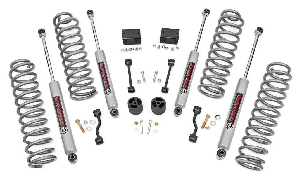 Reinforced Stance. Transform your Rubicon with a more aggressive look and amazing off-road performance, while still maintaining a smooth on-road ride quality. Upgrade to the 2.50-Inch Suspension Lift Kit with Premium N3 Shocks and experience Rough Country’s high-quality materials and advanced suspension technology. This lift system comes with front and rear sets of coil springs, N3 shocks, bump stops, and sway bar links.