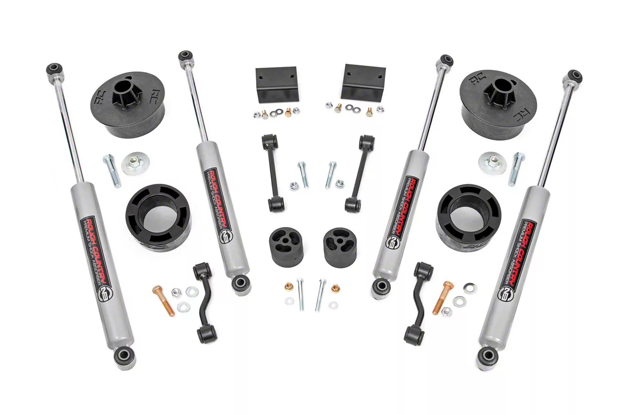 Rugged Elevation. The Rough Country 2.50-Inch Suspension Lift Kit with Coil Spring Spacers and Premium N3 Shocks offers a substantial increase in ride height by 2.5 inches, enhancing off-road performance while maintaining the factory ride quality. This kit allows for the clearance of up to 35-inch tires, perfect for off-road enthusiasts looking to upgrade their vehicle's capability.