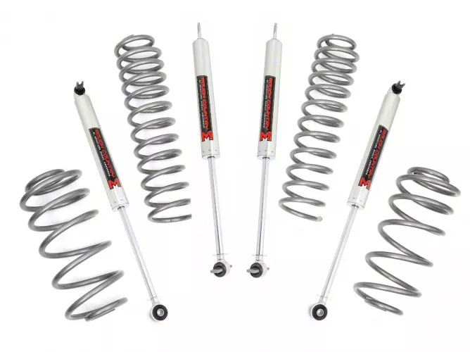 Reliable Functionality. The Rough Country 2.50-Inch Suspension Lift Kit comes with M1 monotube shocks, which provide superior shock absorption and durability. It adds more ground clearance, allowing you to tackle rough terrain with ease. On top of that, it maintains the track width, ensuring that your vehicle's handling remains consistent. It also levels the vehicle's front with the rear, giving it a more aggressive and sporty appearance. Despite the increased height, this lift kit offers a smooth ride quality, ensuring that you remain comfortable and in control at all times.