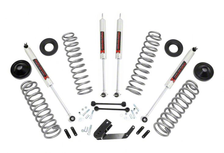 Enhanced Off-Road Capability. The Rough Country Suspension 3.25-Inch Suspension Lift Kit with M1 Monotube Shocks is engineered to elevate the performance and stance of the Jeep Wrangler JK 2-Door. This kit provides improved ground clearance and supports tires up to 35 inches in diameter, enhancing both off-road capability and on-road comfort. It is an ideal upgrade for enthusiasts seeking rugged durability paired with daily drivability.