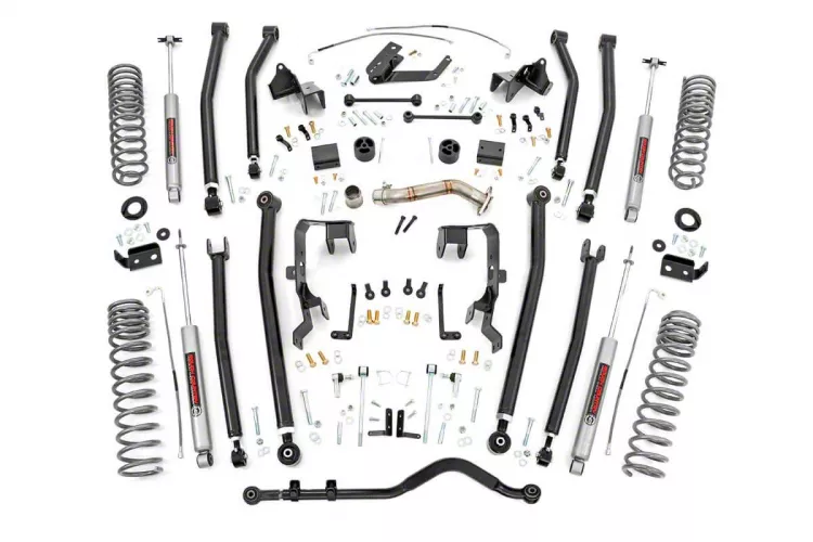 Tough Front and Rear Upper and Lower Control Arms. The Rough Country 4-Inch Long Arm Suspension Lift Kit includes a set of front and rear upper and lower control arms. These control arms are fully adjustable, allowing you to fine-tune your Wrangler’s wheelbase and pinion angle, and provides maximum articulation. These control arms are manufactured from thick-walled steel DOM tubing and uses fully-rebuildable flex joints with Clevite rubber bushings.