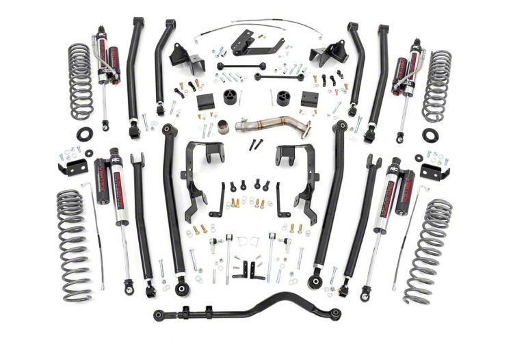 Durable Front and Rear Upper and Lower Control Arms. The Rough Country 4-Inch Long Arm Suspension Lift Kit also comes with a set of front and rear upper and lower control arms. Like the track bar, these control arms are also completely adjustable, enabling you to fine-tune your Wrangler’s wheelbase and pinion angle for exceptional off-road articulation. Additionally, these control arms feature a beefy DOM tubular steel and utilize rebuildable flex joints with Clevite rubber bushings.