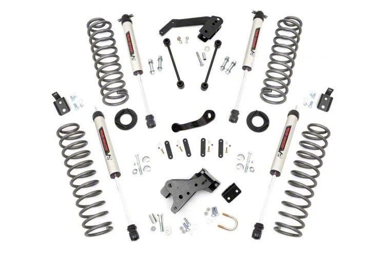 Get Remarkable Lift and an Aggressive Style. Look and feel good while conquering the harshest road conditions and toughest trails with the help of Rough Country’s 4-Inch Suspension Lift Kit with V2 Monotube Shocks. This kit has everything you need to raise your Wrangler's ride height by 4 inches, as well as enhance its road damping performance and ride quality. As a result, your vehicle will not only gain a more commanding presence, but it’ll also have an easier time driving on rough roads.