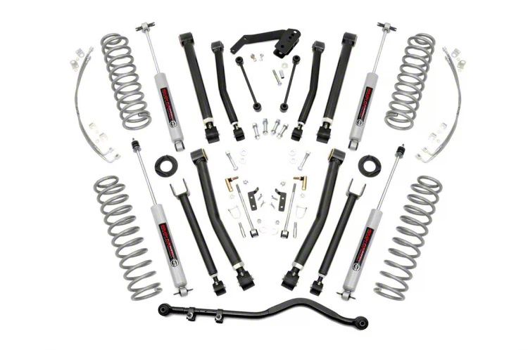 Use. The Rough Country 4-inch Suspension Kit with Premium NS Shocks provides extra ground clearance and also allows you to fit larger tires on your Jeep. The kit also imparts stability while driving through rough terrains.