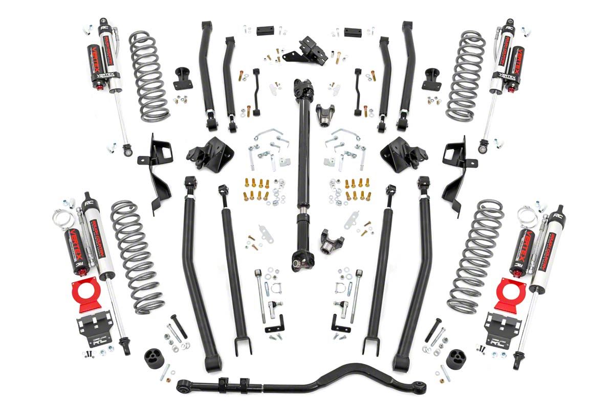 Maximum Off-Road Capabilities and On-Road Comfort. Giving your Wrangler JL a 6-inch lift usually means a compromise of on-road ride quality in favor of off-road performance. Not so with the Rough Country 6-Inch Long Arm Suspension Lift Kit with Vertex Shocks. This suspension lift kit is engineered to maintain proper suspension geometry and ride quality while giving your Jeep 6 inches of added height. This added clearance enables you to take on more aggressive off-road trails while running up to 37-inch tires without sacrificing everyday drivability. What this means is with this kit installed on your Jeep, you can now go on an off-road adventure straight from dropping off the kids at school.