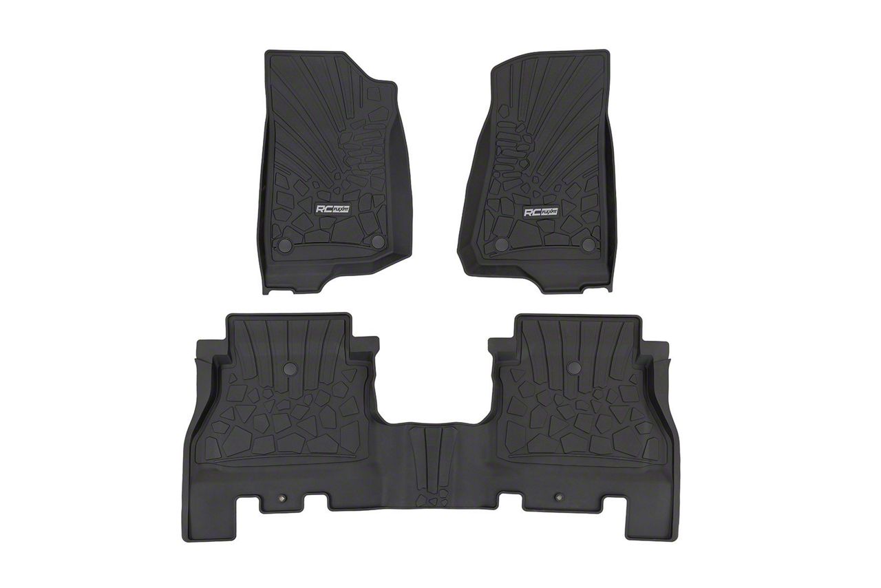 Ultimate Protection and Fit. The Rough Country Flex-Fit Front and Rear Floor Mats provide the ultimate all-weather protection for your Jeep Wrangler JL. Designed to defend against snow, mud, and spills, these mats are essential for maintaining a clean interior. The spill-saver lip helps prevent messes from reaching your carpet, offering both convenience and peace of mind.