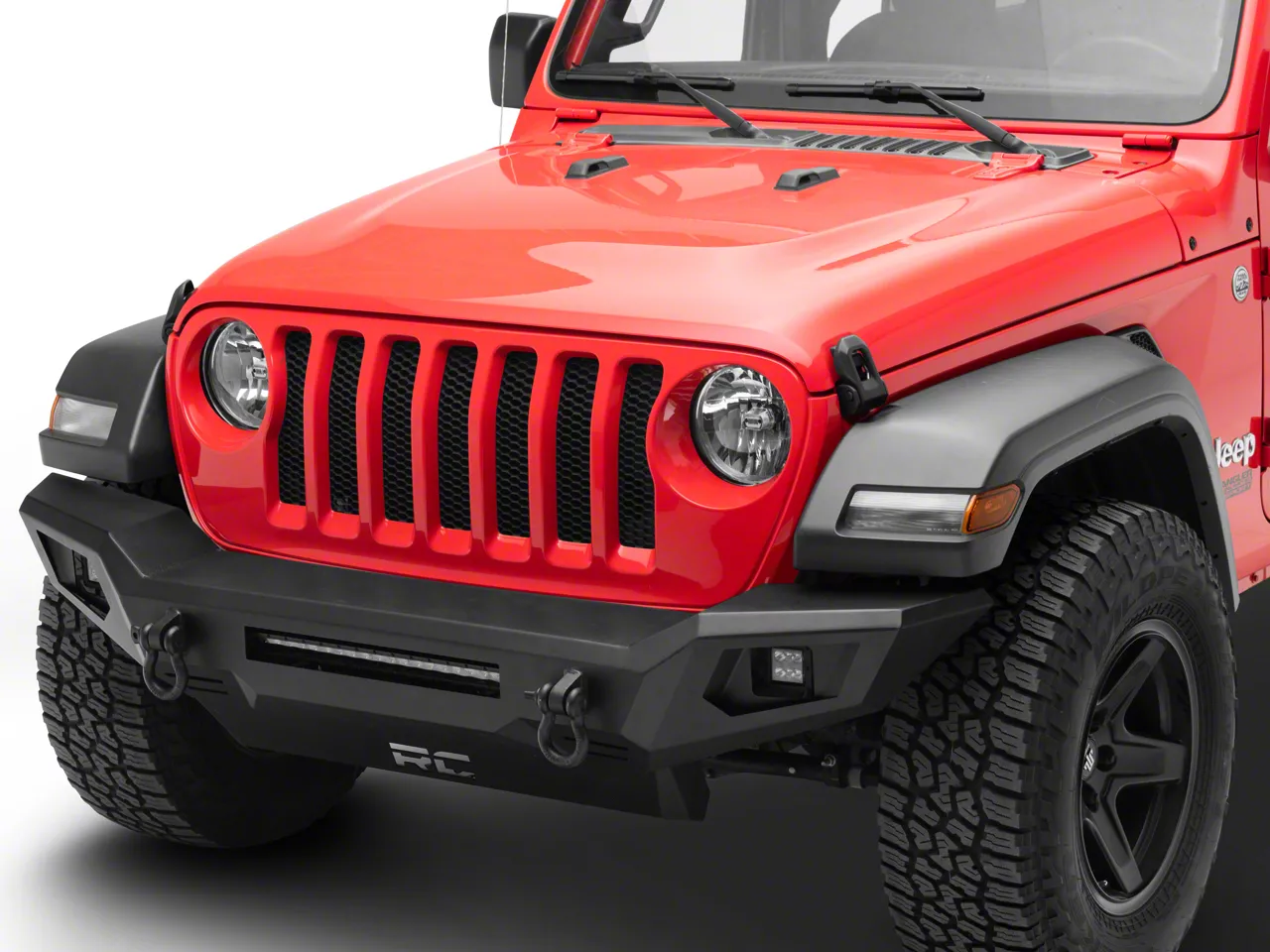 Bolder All-Terrain Confidence. Tailored for your rugged Wrangler, this Rough Country Full-Width Front Bumper in a Satin Black finish is an aggressive upgrade serving as an excellent front armor. It features a bold, full-width bumper with a skid plate, integrated D-rings, and powerful off-road lights. Furthermore, this bumper is engineered to enable your Jeep to climb large obstacles or crawl over huge rocks with ease and confidence. It is also well-designed to provide your JL with an overall protective, dynamic functionality for a bolder off-roading lifestyle.