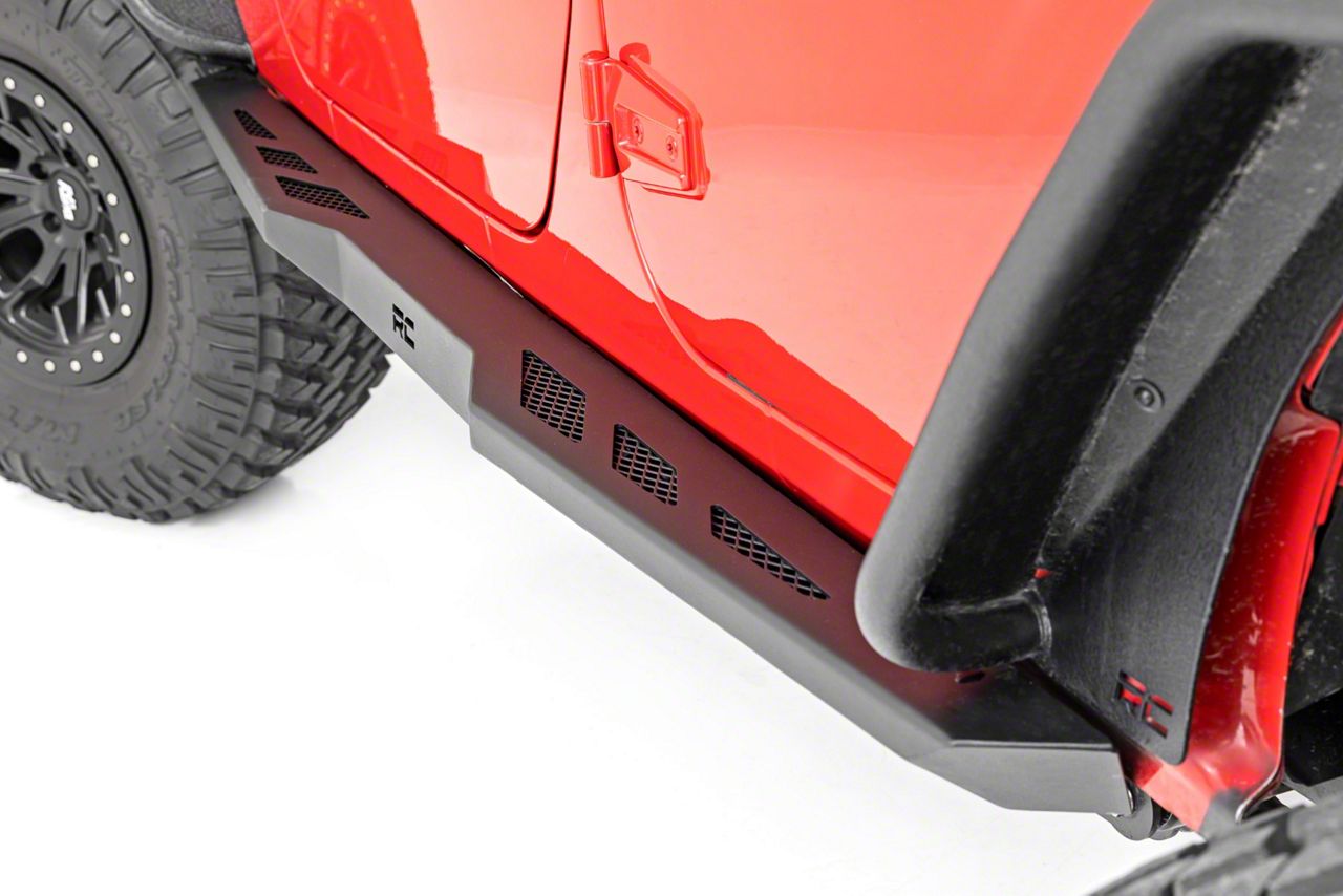 Off-Road Protection. Save your Jeep Wrangler's frame from scratches, punctures and other damage that may be caused by rugged terrain with this this Rough Country Heavy Duty Rock Sliders; Flat Black. Made for hardcore enthusiasts and off-road working professionals, it offers side protection against shrubbery and rocky ground and rubble that can often weaken and damage the frame of your vehicle. Additionally, it also serves as a steady step bar to get you up your vehicle with greater ease.
