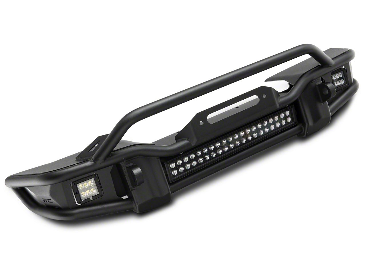 Reliable Illumination. Rough Country equipped this Tubular Winch Front Bumper with LED lights for your auxiliary lighting needs. It includes a 20-inch, dual-row LED light bar that produces powerful 9,600 raw lumens of light intensity with a total of 120-watt output. This bumper also comes with a pair of 2-inch LED cube lights boasting an impressive 2,800 lumens and 36 watts. These lights are especially useful when treading through dense fog or intense rain.
