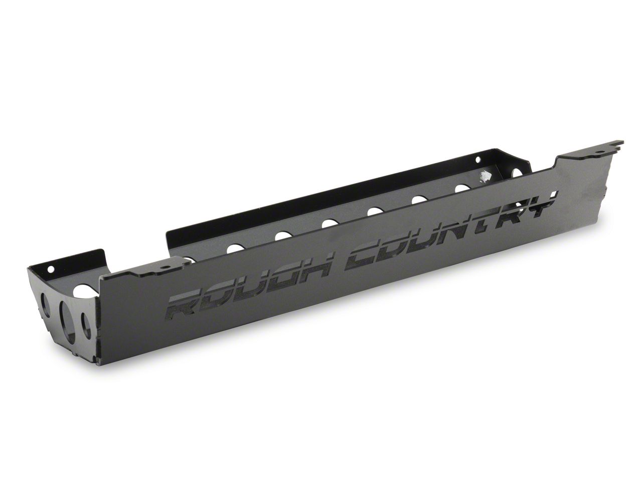 Heavy-Duty Build Quality. The Rough Country Muffler Skid Plate is crafted from 0.187-inch thick plate steel for superior strength. This skid plate is machine-formed and fully welded for a precise fit, and added rigidity. The Rough Country logo is also precision-cut into the component for a unique look. Lastly, this muffler skid plate is finished in a tough textured-black powder coating for maximum rust protection.